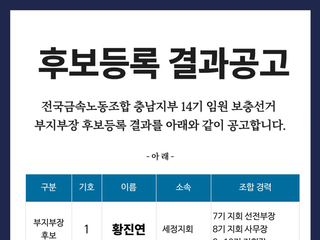 전국금속노동조합 충남지부 14기 임원 보충선거 후보등록 결과공고
